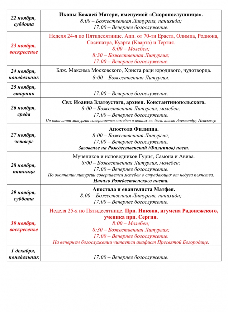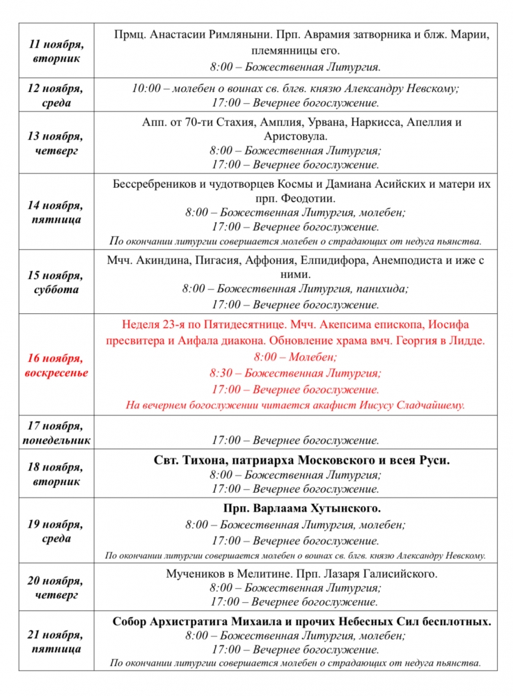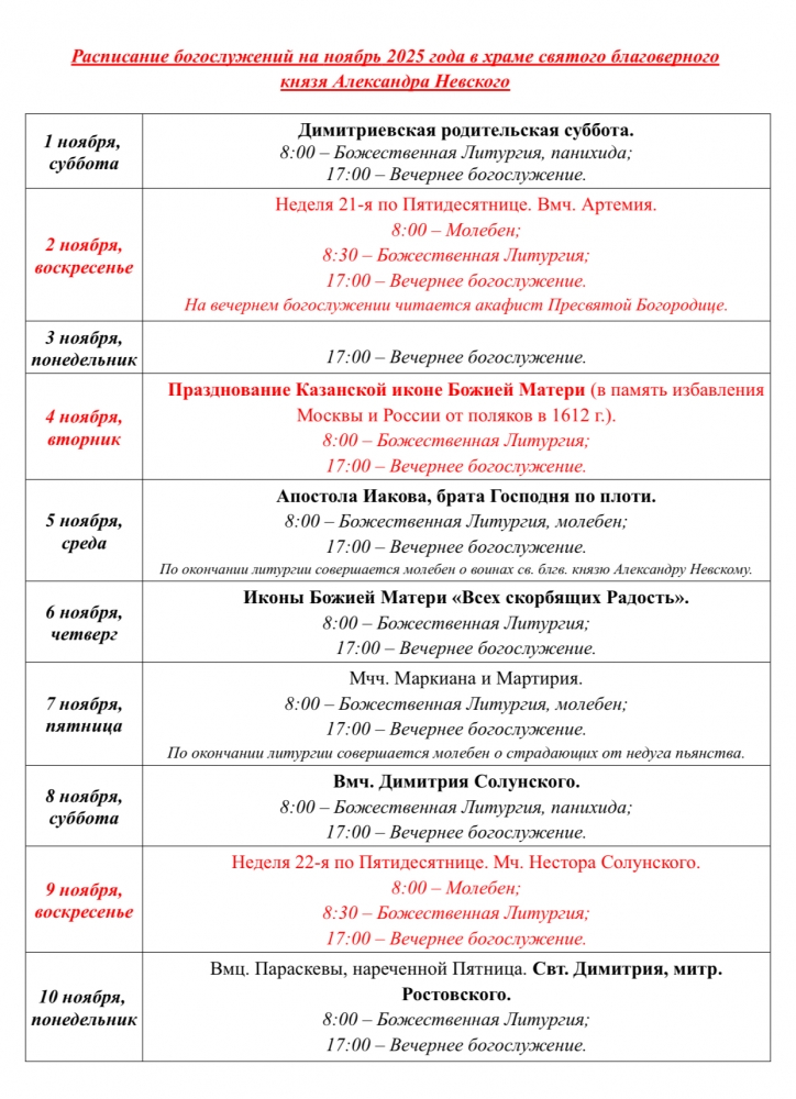Расписание богослужений в храме святого благоверного князя Александра Невского